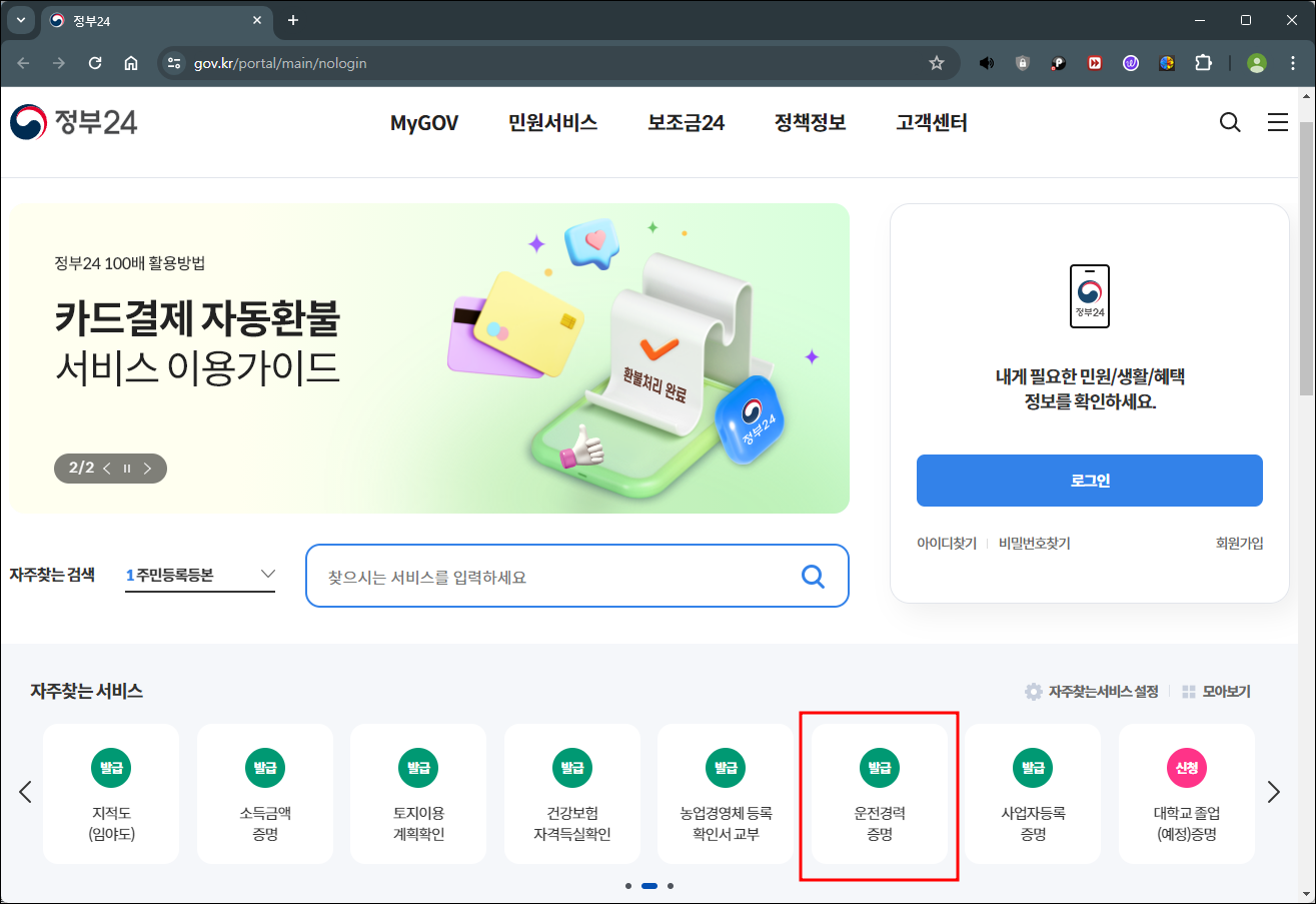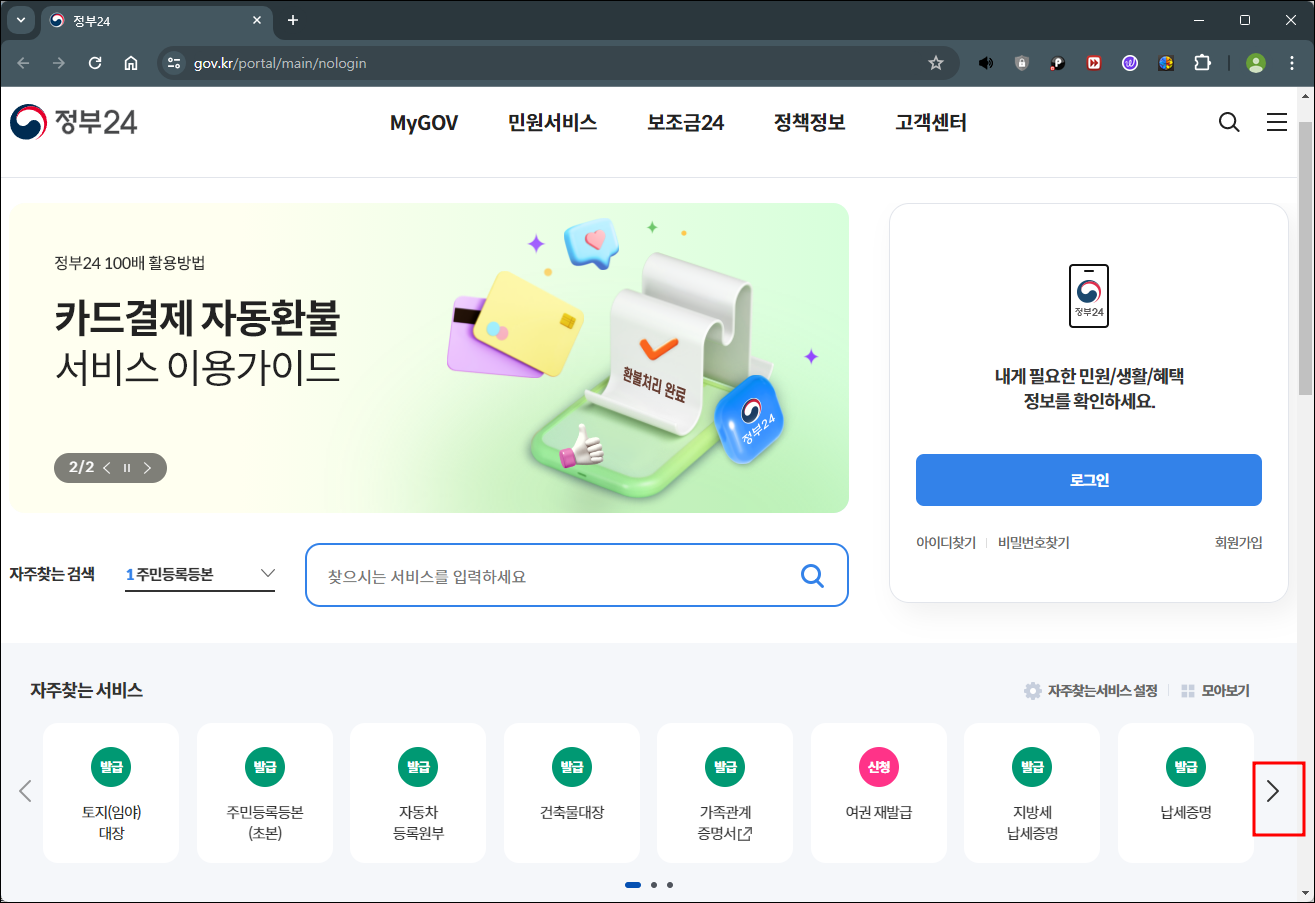2. 아래의 정부24 홈페이지가 나오면, 자주 찾는 서비스란에서 운전경력증명서를 찾아보세요. 만약 보이지 않는다면, 아래의 그림처럼 오른쪽 화살표를 눌러주세요.
