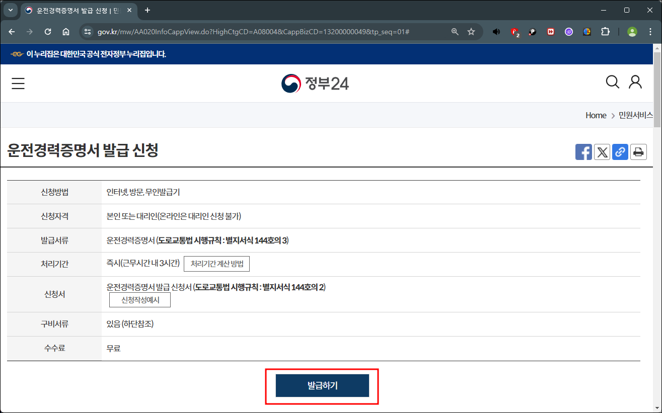 4. 정부24 홈페이지에서는 운전경력증명서 인터넷발급을 무료로 하실 수 있습니다. 아래의 화면이 보이면 발급하기를 선택해 주세요.