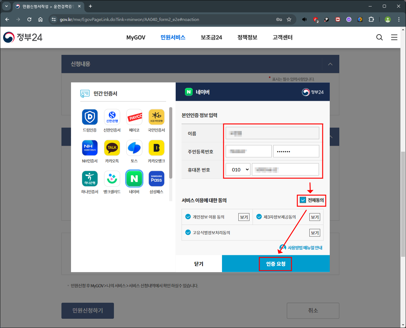 11. 왼쪽에서 간편인증 방법을 선택해 주신 후 우측에는 본인정보와 약관동의를 해주신 후 인증요청을 클릭해주세요. 저는 네이버 인증으로 진행을 해보도록 하겠습니다.